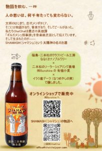 【メソポタミアの太陽「SHAMASH(シャマシュ)」誕生ストーリー】 人の想いは、何千年たっても変わらない。 5000年前の古代メソポタミア、世界最古の物語といわれるギルガメシュ叙事詩の中でも飲まれていたビール。 文字を発明したメソポタミアの人たちは、ビールの作り方を粘土板に刻んでいました。 そしてナツメヤシは「生命の樹」とも呼ばれ、古代メソポタミア時代から現代に至るまで人々に深く愛されてきました。イラクでは国樹に指定されています。私たちChalChalは『ギルガメシュ叙事詩』を音楽紙芝居として伝えています。 そして生まれたのが――SHAMASH(シャマシュ)という太陽神の名のお酒。 メソポタミア(現代のイラク)産の歴史あるデーツ(ナツメヤシの実)で、現代のクラフトビールという形で蘇らせます。『ギルガメシュ叙事詩』を奏でるChalChalがつくるお酒。 それが、メソポタミアの太陽「SHAMASH(シャマシュ)」です。 【有機小麦】 原料には福島県二本松市の株式会社 Sunshineによる「ソーラーシェアリング(営農型発電)」という新しい農業でそだった小麦を使いました。 二本松営農ソーラー株式会社&株式会社Sunshineさんのホームページ 【クラフトビール工房】 そして、福島県二本松市の山間で、キュウリ、ミニトマト、インゲン、ホウレンソウなどの野菜を有機栽培で育てている「ななくさ農園」では、冬の間、小さな納屋を改造した「ななくさナノブルワリー」でクラフトビールが作られています。地元の素材を生かした「風土の味がする麦酒」づくりを心がけておられるオーナーの関元弘さんと一緒にレシピを考えました。 ななくさ農園&ななくさナノブルワリーさんのホームページ 【命名】 SHAMASH(シャマシュ)はメソポタミア神話に登場する太陽神で、命と再生、そして希望の象徴。世界最古の叙事詩『ギルガメシュ叙事詩』においては、主人公ギルガメシュとその友エンキドゥの守護神です。今回「SHAMASH(シャマシュ)」を販売してくださる株式会社Sunshineさんともぴったりの名前です! 物語を飲む、一杯。 メソポタミアの太陽「SHAMASH(シャマシュ)」 【クラファン応援ありがとうございました】 メソポタミア文明のビールを福島で作りたい!クラウドファンディング 【オンラインショップ】 メソポタミアの太陽「SHAMASH(シャマシュ)」購入サイト (株式会社 Sunshineさんより販売)*瓶内2次発酵製法 品目:発泡酒